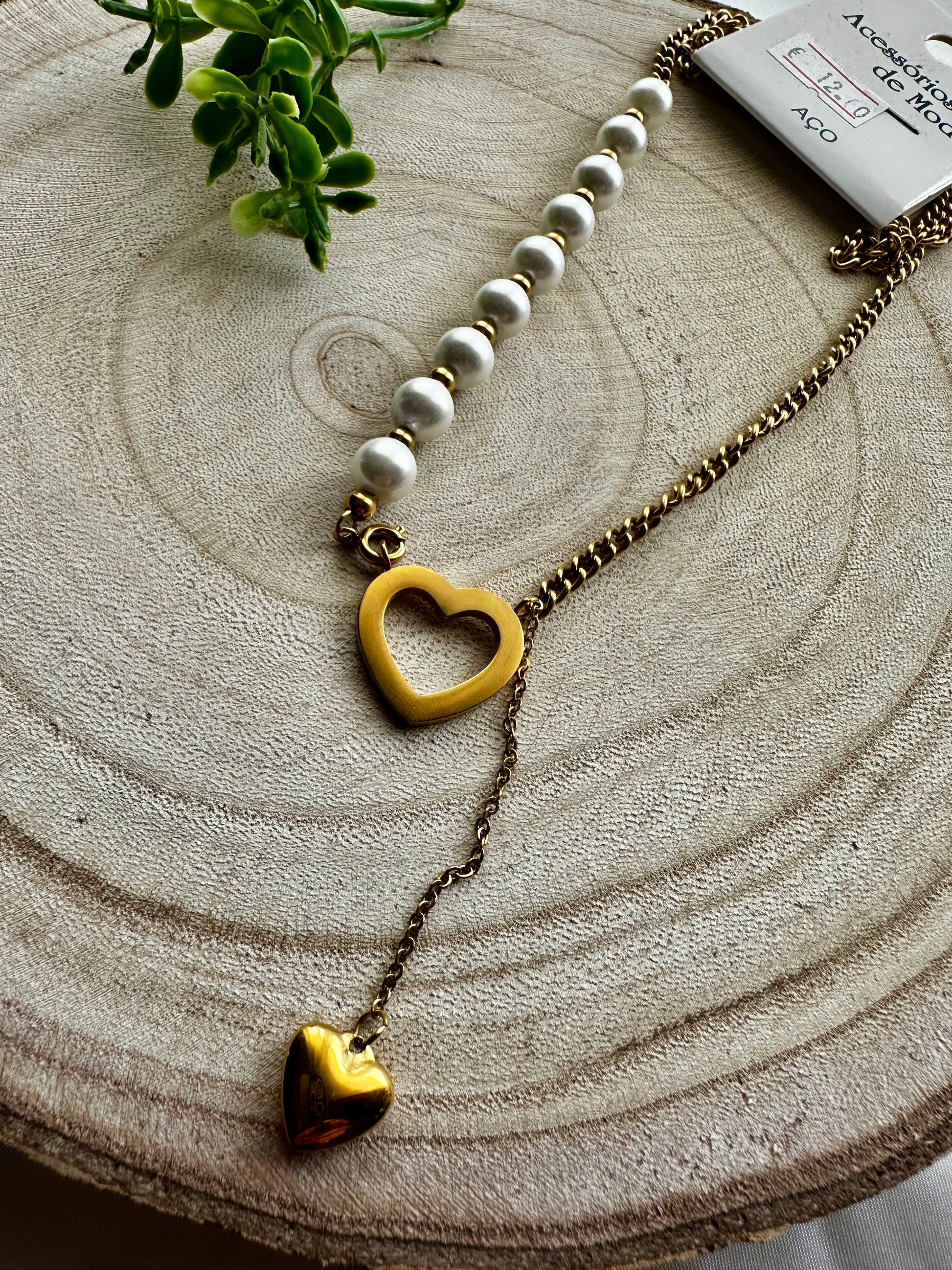 Colar em aço inoxidável, com metade da malha em pérolas e Dois corações, um deles em pendente! Um clássico, diferente, para um look esplêndido!