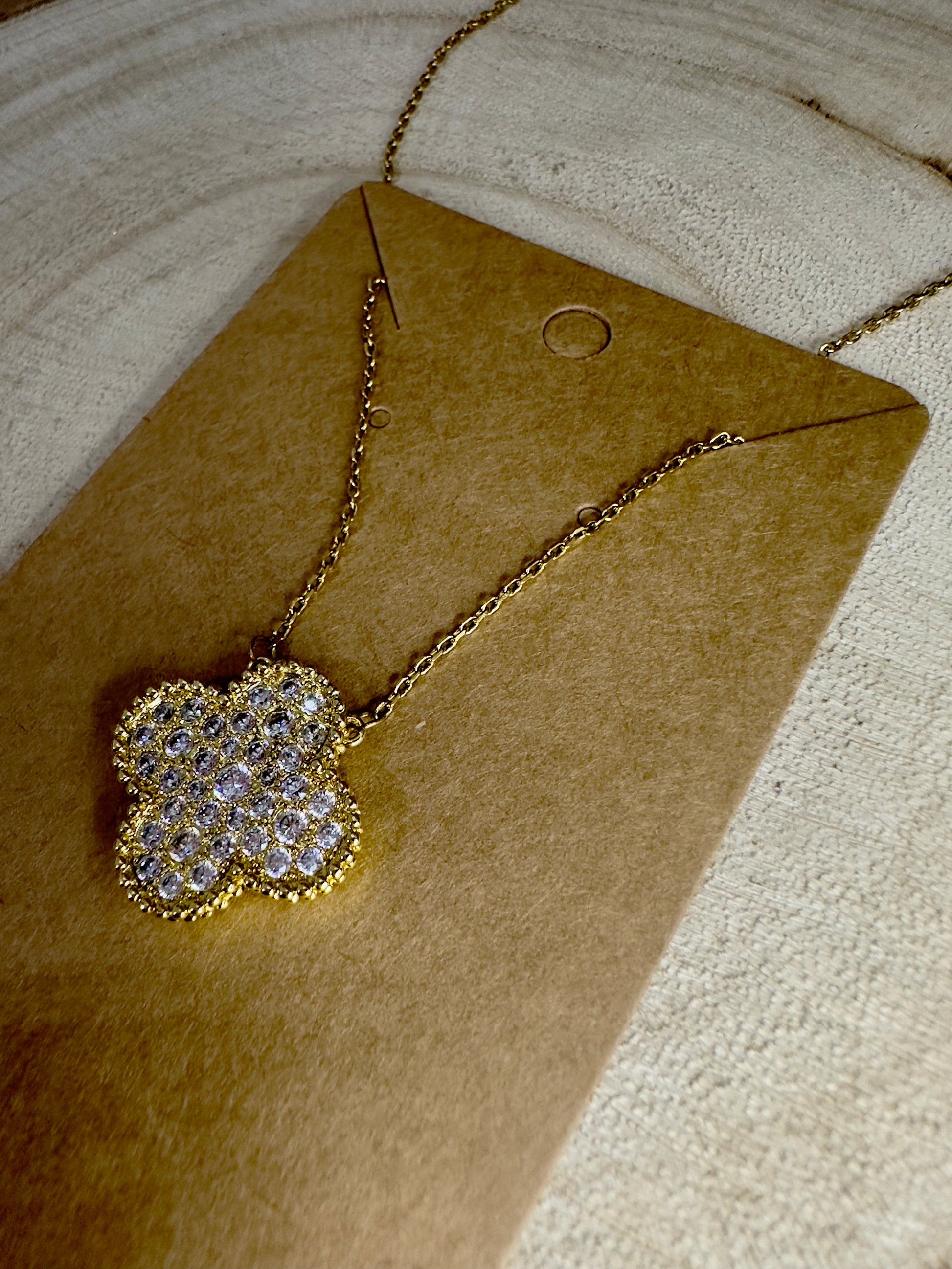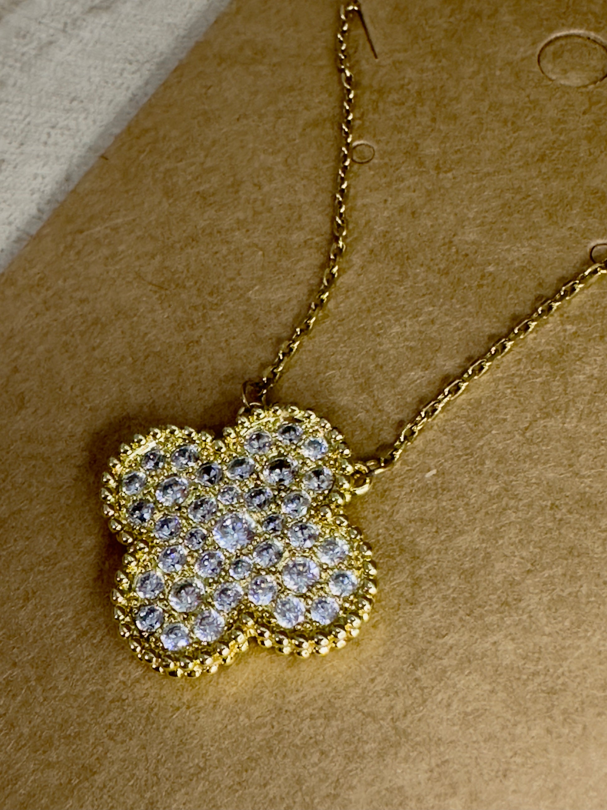 A medalha em forma de trevo, símbolo universal de boa sorte, é delicadamente cravada com zircônias brilhantes, criando um efeito cintilante que captura a luz em cada movimento.