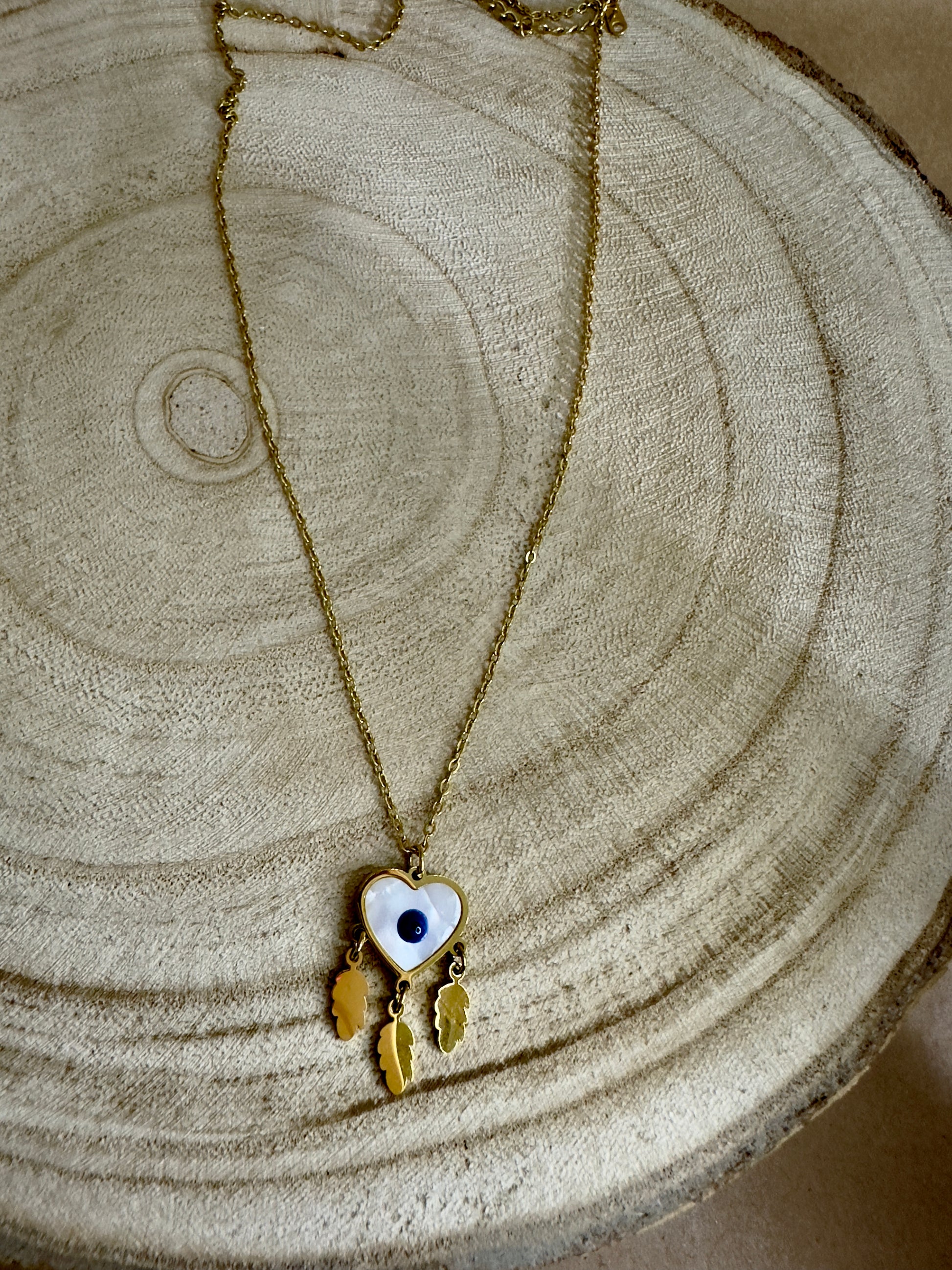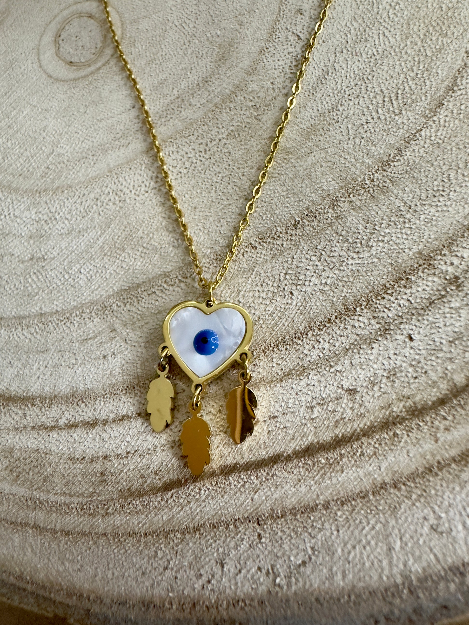 A medalha caça-sonhos simboliza proteção e boas energias, enquanto o olho Grego no seu interior atua como amuleto contra o mau-olhado.