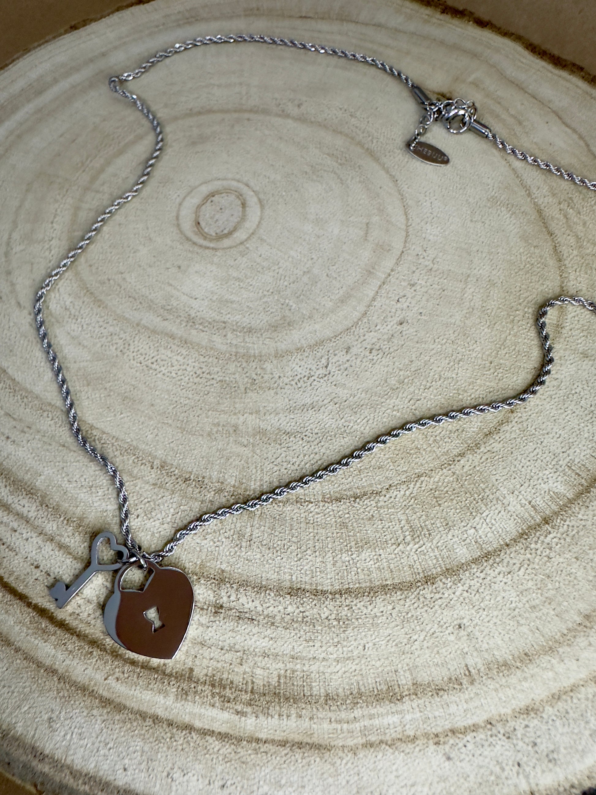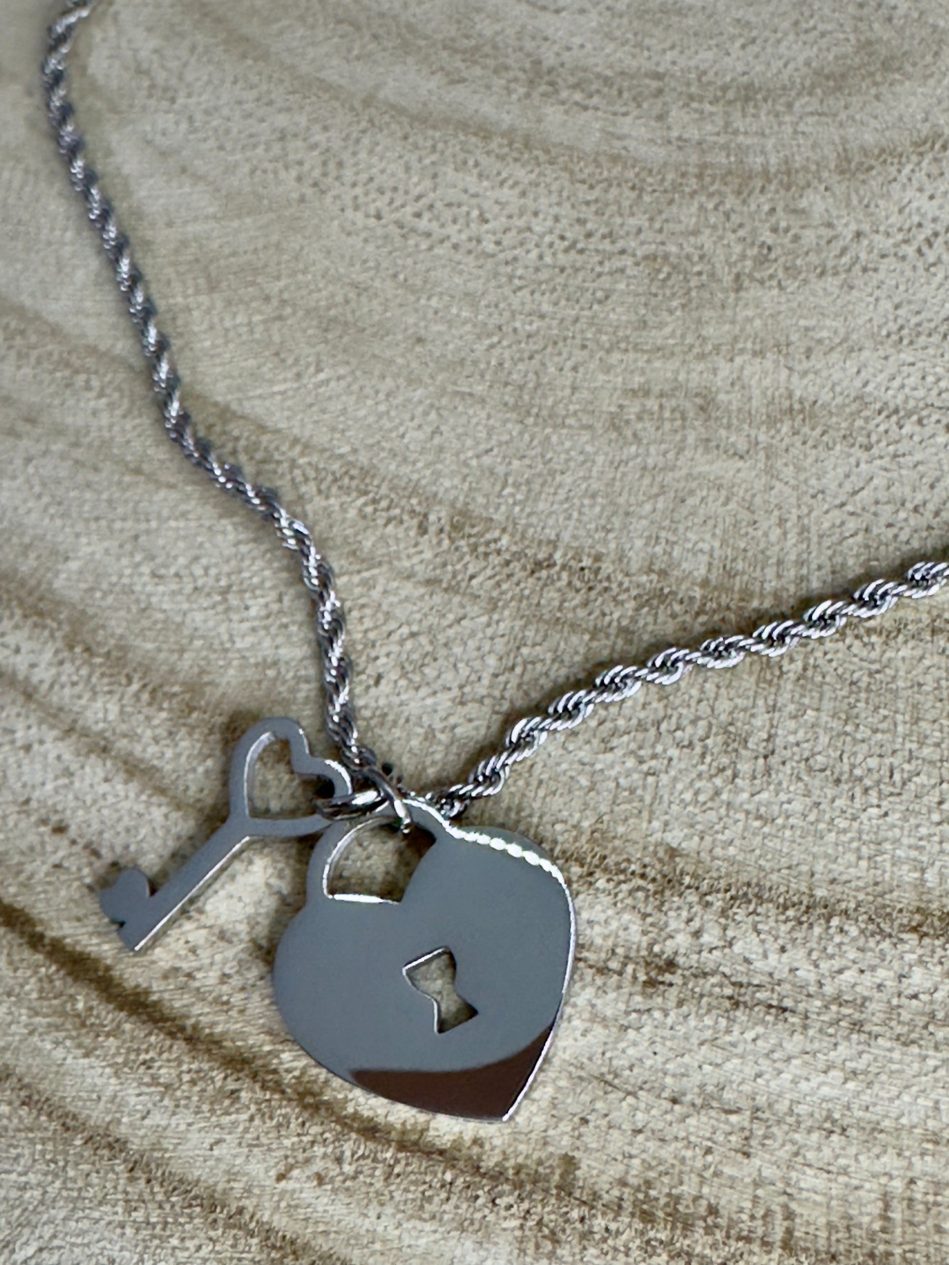Esta peça delicada apresenta uma medalha em forma de coração/cadeado acompanhada de sua chave, simbolizando amor, confiança e união.